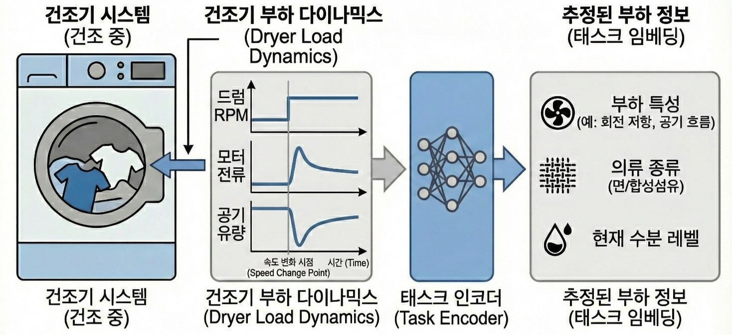 내가 처음으로 해보려고 했던 것은 과연 가전과 같은 실물 환경에서도 이런 메타강화학습 기법이 적용가능할까 하는 부분이었다. 대부분의 메타강화학습 논문의 서문에도 제시되어 있는 내용이지만, 메타강화학습이 지향하는 목표는 어떻게 보면 실물 환경에서는 진짜 매혹적이다. 아니 어떻게 하면 실제 학습하지 않은 환경에서도 잘 동작할 수 있는 모델을 만들 수 있는 것일까 하는 궁금증에서 출발하여 올해 건조기에다가 처음 적용해보고자 했다. 이전에 시도했던 세탁기 강화학습 처럼 실물 환경에 놓인 건조기도 비슷한 문제를 가지고 있다. 실제 실험실에서 학습하고 실험하는 세탁물뿐만 아니라 실제 고객들이 사용하는 세탁물에서도 최적의 건조 성능이 나와야 하는데, 문제는 다양한 고객들이 실제로 넣을 세탁물의 조합이 거의 무한대에 가깝다는 것이다. 어떤 사람은 소량의 세탁물만 넣고 건조시킬수도 있고, 어떤 사람은 이불과 같이 크고 묵직한 세탁물을 건조시키려고 할 것이다. 사람에 따라서는 운동복과 같이 잘 마르는 재질의 세탁물이 많을 수도 있고, 자녀가 많은 가정에서는 면 재질의 세탁물이 많을 것이다. 이렇게 사람의 특성과 생활 패턴에 맞게 건조시켜줄 수 있는 강화학습 모델을 만드는 것이 목적이었고, 이렇게 범용적인 세탁물 건조 (혹은 Task)에 대응할 수 있는 강화학습 모델을 만들려고 했다.