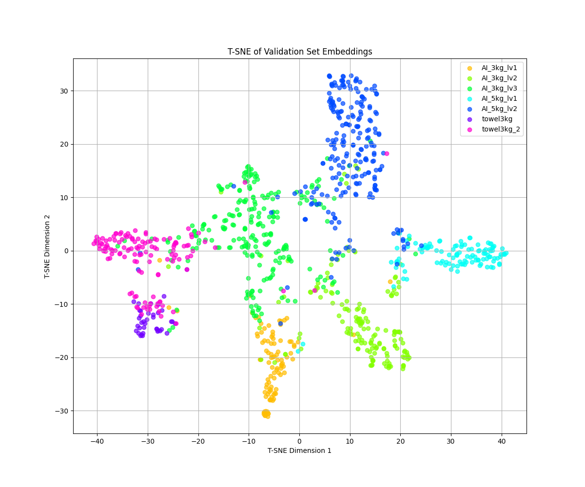 이를 위해서 정의한 것이 건조기 다이나믹스라는 것이다. 모든 실물 강화학습에 적용되는 내용이겠지만, 시뮬레이터가 없는 일반적인 환경에서 어떤 유격을 가했을때 센서의 변화량이 담긴 데이터를 토대로 나름의 기구내에서 세탁물이 움직이는 것에 대한 다이나믹스를 추정하고자 했다. 이에 대한 정보를 강화학습 모델 학습시 조건부 확률의 요소 중 하나로 넣게끔 했다. 또한, 정확한 부하 예측이 아닌 유사한 부하를 뭉치게 하는 것이 목적이므로 일반적인 Cross Entropy Loss가 아닌, Supervised Contrastive Loss 같은 것도 적용해보고 조금 더 구분 성능을 개선하기 위해서 ArcFace Loss도 적용해봤다. 그랬더니 실제 Task Encoder를 통해서 나온 정보들이 비슷한 세탁물끼리는 뭉치고, 조금 차이가 나는 세탁물끼리는 구분이 되는 형태까지는 도출할 수 있었던 것 같다.