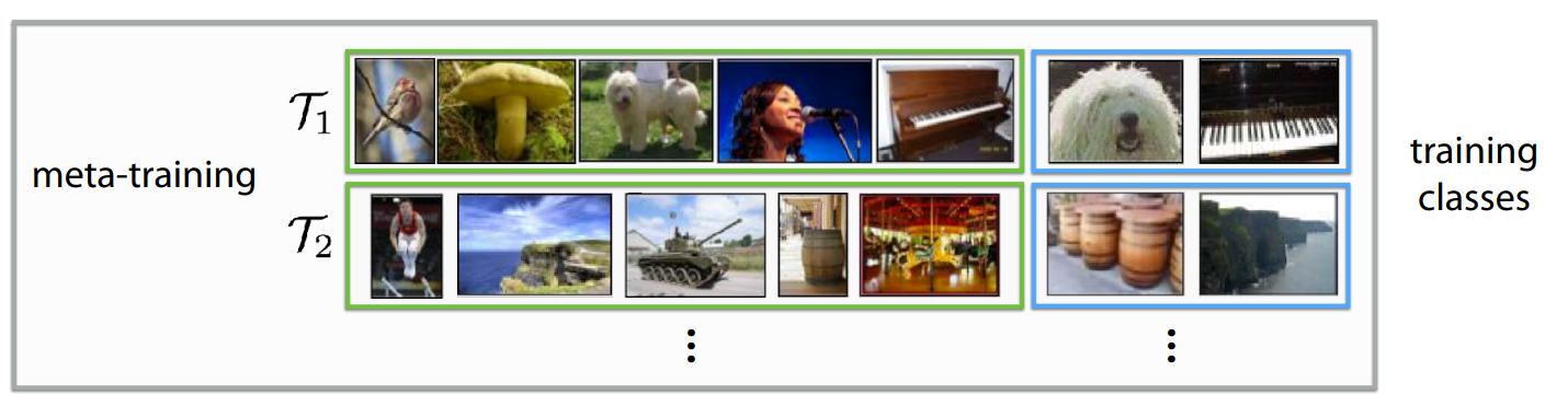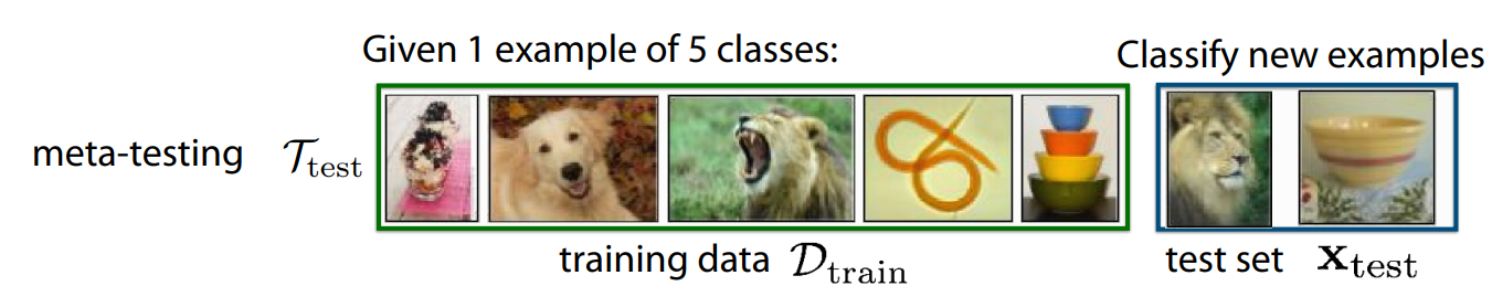 그러면 학습에 대한 objective function은 learning a task ( \(\mathcal{D}_i^{tr} \rightarrow \theta\) )가 될 것이고, 작은 \(\mathcal{D}_i^{tr}\) 로도 objective function을 최소화시킬 수 있는 방법을 찾는 것이 meta-learning에서의 근본적인 목표이다.