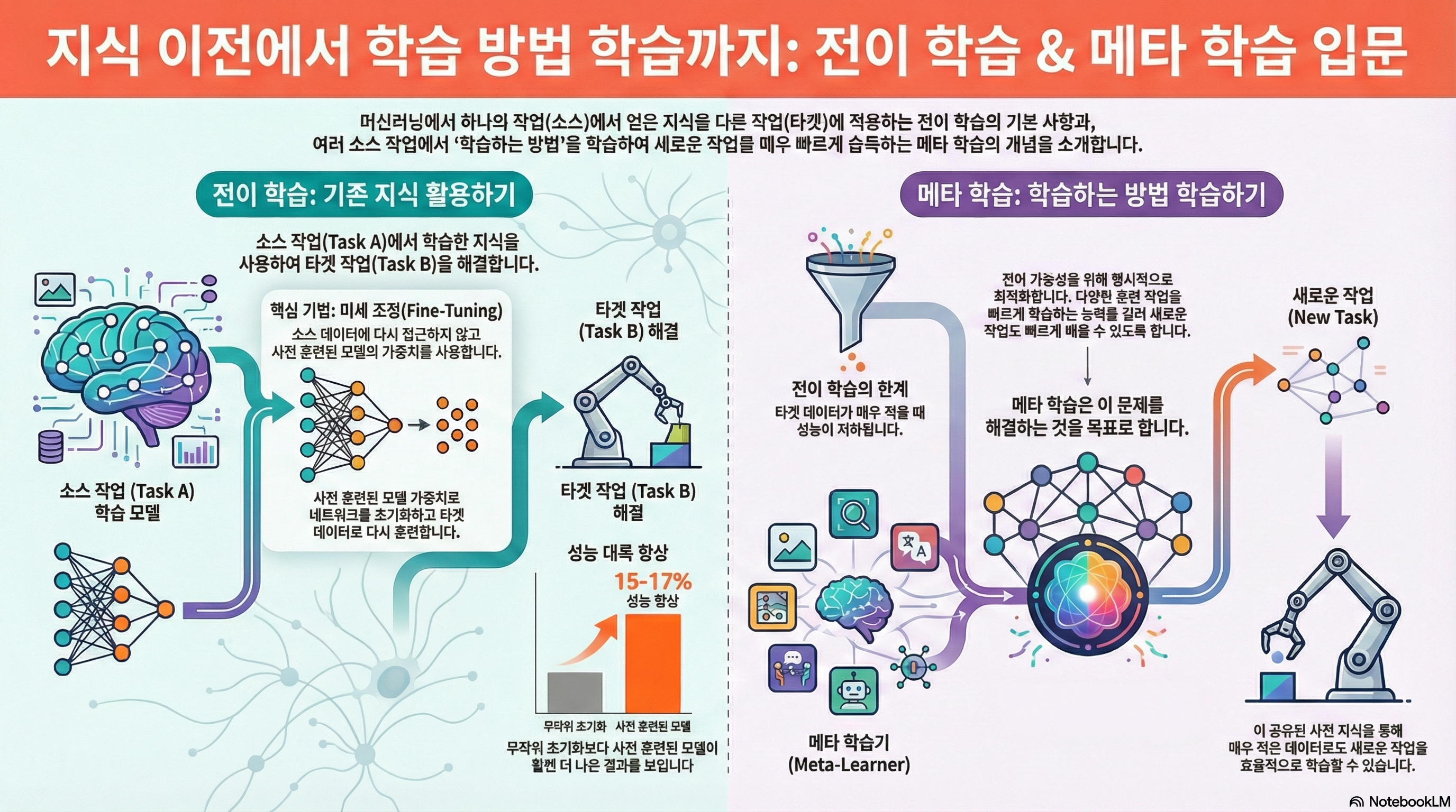 사실 강의에서는 학생들의 질문이 많아, 강의 자료에 있는 내용을 많이 skip하고 넘어간 부분이 있어서 개인적으로 강의자료를 보고 정리해보았다. 전체 내용을 요약해보자면, 이전 강의에서 다뤘던 multi-task learning과는 다르게 transfer learning에서는 source task \(\mathcal{T}_a\) 에서 학습했던 지식 기반으로 target task \(\mathcal{T}_b\) 를 해결하는 것이 목적이며, 일반적으로 사전에 확보된 방대한 데이터로 학습하거나, 미리 학습된 가중치를 기반으로 fine-tuning하는 방식이 수행된다. 그래서 fine-tuning하는 방법에 대해서도 소개가 되었고, meta learning에서는 결과적으로 수많은 source task에 대한 transfer learning을 수행하는 형태가 된다. 일반적으로 meta learning에서는 task간의 공통된 특성을 찾는 것이 목적이 되므로, 적은 샘플 내에서 학습한 후, 새로운 target task에서 얼마나 빠르게, 정확하게, 안정적으로 대응할 수 있는지를 찾는 과정이라고 보면 될 것 같다.