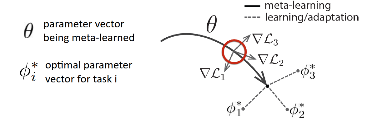 논문에도 소개되어 있는 그림 3 그림을 보면 조금더 이해가 될텐데, 우선 \(\theta\) 는 모델의 초기 parameter이고, 굵은 실선을 통해서 Meta Learning 이 이뤄지는 과정을 표현한 것이다. 만약 주어진 task가 3개가 있고, 각각의 loss function (\(\mathcal{L}_1, \mathcal{L}_2, \mathcal{L}_3\)) 가 있다고 가정했을 때, 각 loss 에 대한 gradient (\(\nabla \mathcal{L}_1, \nabla \mathcal{L}_2, \nabla \mathcal{L}_3\))도 표현되어 있는 것처럼 다르게 나타날 것이다. MAML이 궁극적으로 추구하는 것은 3개의 task를 잘하는 각각의 optimal parameter \(\phi_1*, \phi_2*, \phi_3*\) 를 찾는 것이 아니라, 몇번의 최적화 step으로도 각각의 optimal parameter에 빠르게 도달할 수 있는 \(\theta*\) 를 찾는 것이다. 말 그대로 fast-adaptation 할 수 있는 지점을 찾는 과정이 표현된 것이다. 교수는 부가적으로 그림의 정의에 대해서 다시 설명했는데, \(\theta*\) 를 찾는 과정 자체가 어떤 task에 대한 단일 optimal point를 찾는 것이 아니라, 다양한 task 에서 빠르게 대응할 수 있는 parameter space 를 찾는 것이라고 설명했다. 또한 그림 자체가 Task의 평균 gradient로 update되는 것처럼 보이지만, 실제로는 다양한 전략 등을 통해서 parameter가 update된다는 점도 부연적으로 언급했다.