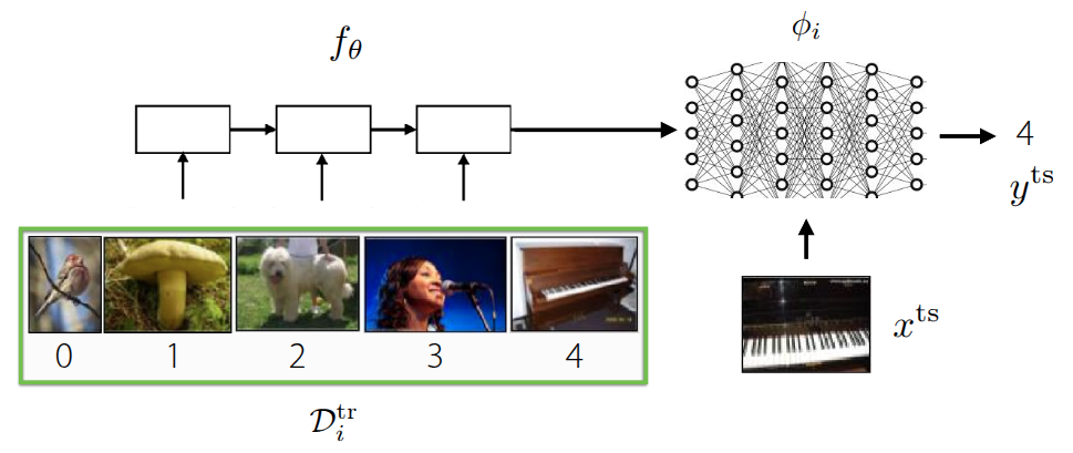 - Black-Box Adaptation (\(y^{ts} = f_{black-box}(\mathcal{D}^{tr}_i, x^{ts})\)) : 학습 데이터 \(\mathcal{D}^{tr}\) 과 테스트 입력 \(x^{ts}\) 을 RNN이나 Transformer같은 거대한 신경망에 통째로 집어넣는다. 그래서 black-box 신경망 내부의 연산을 통해서 \(\mathcal{D}^{tr}\) 의 패턴을 파악하고 결과를 출력하는 형태로 이뤄진다.