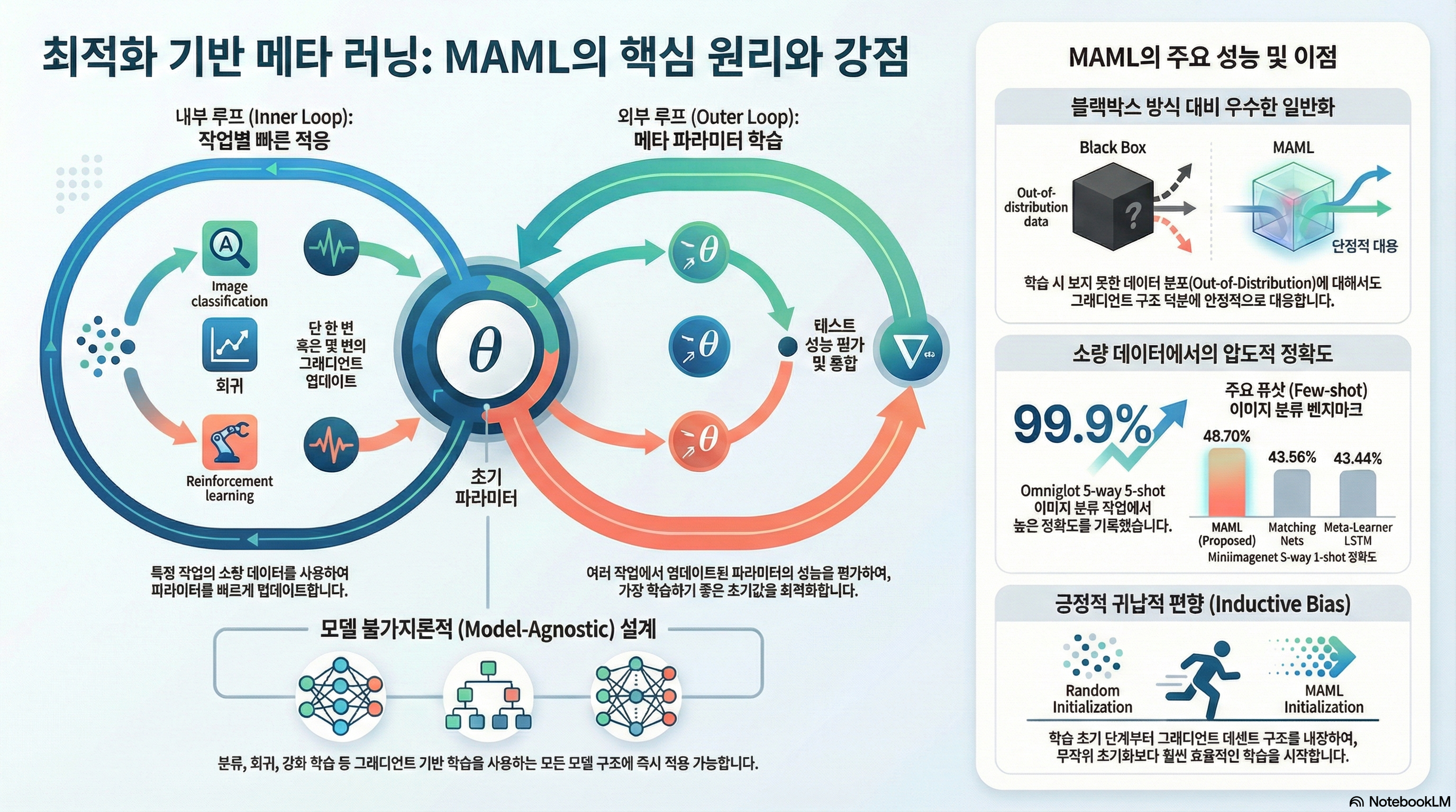 이렇게 하면 별도의 장치없이 데이터셋의 정보만으로 어떤 Task인지 추론하고, 이에 대한 판단을 black-box 신경망이 하게 되므로 데이터셋의 형태에 따라 조금 더 표현적으로 대응할 수 있다. 하지만 기존에 학습되지 않은 새로운 유형(Out-of-Distribution)의 task가 나오면 데이터에 의존하는 특성상 성능이 급격히 떨어질 수 있고, 문제에 따라서 적용할 수 있는 최적화 기법의 종류나 hyperparameter 같은 최적화 문제가 남아있기는 하다. 그러면 여기서 던질 수 있는 질문은, “최적화 문제도 Meta-learning안에 직접 포함시킬 수 있지 않을까?” 이 내용이 이번 포스트에서 다룰 Optimization-based Meta Learning 의 핵심적인 내용이다.