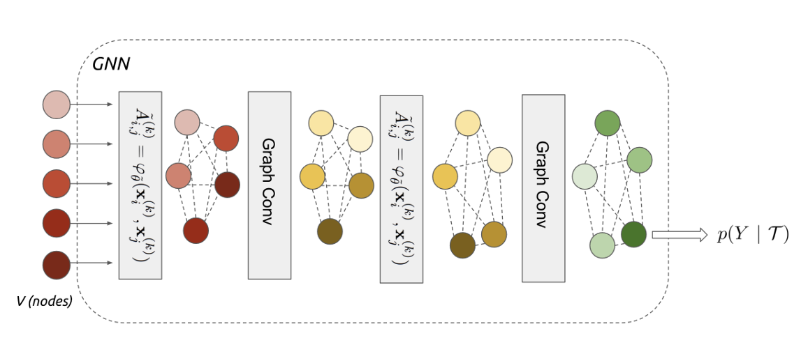 Garcia 와/과 Bruna (2017) 에서는 그림 9 에 나온 Graph Neural Network (GNN) 이란 구조를 Few-shot Learning에 활용하는 방법에 대해서 소개했다. 교수도 해당 구조나 논문에서 소개된 Message Passing 에 대한 내용은 강의의 범주를 넘어서기 때문에 자세하게 설명하지 않았지만, 핵심적인 아이디어에 대해선 간략하게 언급했다. 우선 앞에서 언급한 데이터간의 복잡한 관계성을 해소하기 위해, 개별 training 데이터와 test 데이터를 독립적으로 보지 않고, 하나의 큰 Graph의 Node로 보았다. 그 후 Graph Convolutional Layer를 통해서 Embedding 데이터를 추출하는데, 이때 Node 들간에 반복적인 Message Passing (Iterative Message Passing), 즉 서로의 Node 간의 정보를 계속 주고 받는 작업을 수행한다. 이렇게 업데이트된 Node들의 정보를 바탕으로 새로운 test 데이터가 어떤 class에 속할지 확률값을 추론하게 되는게 전체적인 동작 원리였다. 이에 대한 심층적인 이해를 위해서는 Stefano Ermon 교수의 CS236.Deep Generative Models 강의에서 다뤄지는 Message Passing 기법이나 Undirected Graphical Model 부분을 참조할 것을 언급했다.