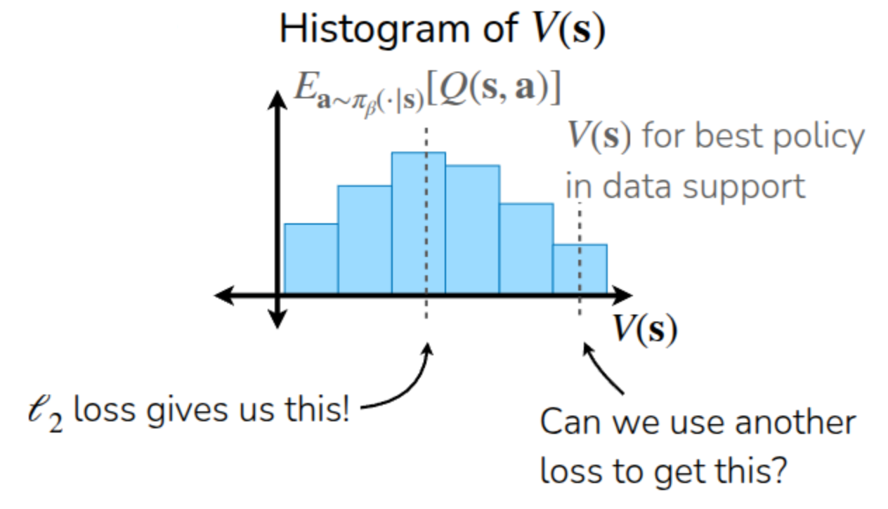 강의에서는 그림 3 의 예시를 통해서 이에 대한 설명을 진행했는데, 앞에서 설명했던 것처럼 \(\pi_{\beta}\) 를 사용하여 수집한 데이터를 통해 \(V(s)\) 를 추정하는 모델을 \(\ell_2\) loss를 사용하여 학습시킨다면, \(\mathbb{E}_{a \sim \pi_{\beta}(\cdot \vert s)}[Q(s, a)]\) 에 해당하는 중간 지점을 추정하게끔 학습하게 된다. 그래서 Kostrikov, Nair, 와/과 Levine (2021) 논문에서 제안한 것은 \(\ell_2\) loss가 아닌 Asymmetric loss, 즉 error의 방향에 따라서 penalty를 다르게 주는 loss function을 사용하는 것이었다. 이를 통해서 평균이 아닌 상위 70%, 90%(Upper Expectile)의 value function을 추정할 수 있다면, 그만큼 기존 방식보다 조금더 좋은 action을 찾을 여지도 커질 것이다. 물론 데이터셋 내에서만 action을 query하므로 Out-of-Distribution Action으로 인한 Overestimation 문제도 없게 된다.