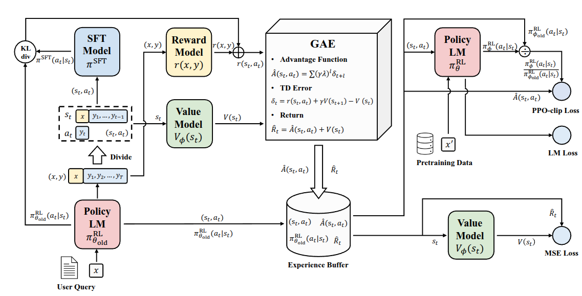 이렇게 RLHF를 통해서 학습된 Language Model의 성능이 입증되면서 LLM 학습시 강화학습이 활용된 사례가 점점 늘어났다. 아래의 그림은 Zheng 기타 (2023) 논문에서 소개된 강화학습 프레임워크이다.