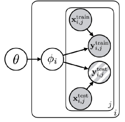 First, the content inside the box represents the typical task learning process: finding the parameter \(\phi\) that best explains the given data \(x, y\). The external variable \(\theta\) serves as the parameter for Meta-Learning; simply put, it represents the shared structure or knowledge across tasks. In this Meta-Learning structure, \(\theta\) (the shared structure) sits at the top and influences the task-specific parameters \(\phi_i\). In turn, \(\phi_i\) becomes the parameter that explains the data for each specific task. Consequently, all tasks involved in the learning process share the common knowledge \(\theta\).