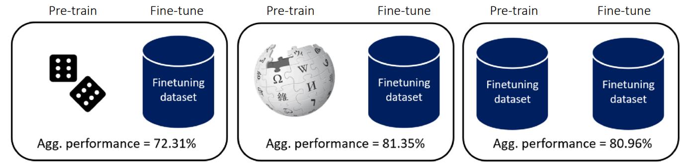 Figure 2 illustrates findings from Krishna et al. (2023). The authors conducted experiments comparing model performance based on the difference between datasets used for pre-training and fine-tuning. The middle case represents pre-training on massive data (like Wikipedia) followed by fine-tuning on a defined dataset. While one might generally expect this to yield the best results, the findings show that unsupervised pre-training using only the data relevant to the Downstream task (the target task mentioned earlier) produces comparable results. This implies that pre-training data does not necessarily need to be diverse; learning meaningful features is possible using only the target dataset.
