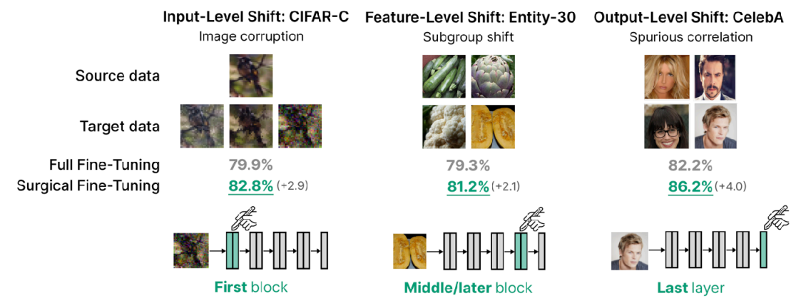 In general transfer learning, it is known that retraining the last layer (head) is effective because it is the most task-specific part. However, the author’s idea was: “If the goal is not just label prediction but handling low-level pixel corruptions, shouldn’t we modify the intermediate or earlier layers?” Consequently, the experiment verified fine-tuning effects not only on Output-Level Shift (CelebA dataset), which aligns with conventional wisdom, but also on Feature-level shift (Entity-30 dataset) and Input-level shift (CIFAR-10-Corruption), which involve changes at lower levels. The results in Figure 3 confirm that fine-tuning the first or even intermediate layers—rather than just the last layer—can yield excellent performance depending on the context.