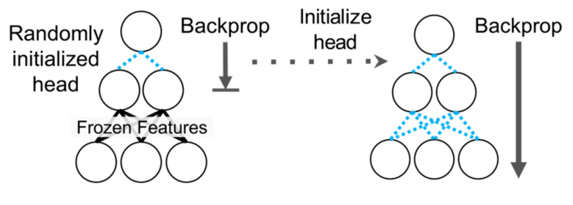Therefore, the method introduced in Kumar et al. (2022), as shown in Figure 4, utilizes both approaches. First, only the head is trained (Linear Probing). Once the validation loss converges to some extent, the entire network is unfrozen and fine-tuned. Generally, in transfer learning, the head is randomly initialized to match the target task. If the entire network is trained from this state, the “weird” gradients generated from the randomly initialized head can disrupt the parameters of the feature extractor that were painstakingly learned. This phenomenon is commonly referred to as Feature Distortion. The proposed LP-FT method offers advantages in terms of robustness by mitigating this distortion that can occur during fine-tuning.