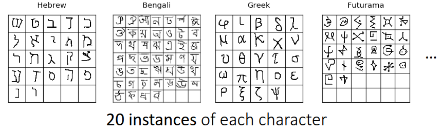 Before explaining the training process of Meta-Learning, the lecture briefly introduced commonly used benchmarks in the field. Figure 1 shows the Omniglot dataset introduced by Lake, Salakhutdinov, and Tenenbaum (2015). While similar to the well-known MNIST benchmark in terms of character recognition, there is a key difference: while MNIST consists of a small number of classes (0-9) with a large amount of data per class, Omniglot contains 1,623 characters from 50 different alphabets, with only 20 samples per class. Due to this characteristic of having “many classes with few samples”, it is widely used to define Meta-Learning problems and is often referred to as the “transpose of MNIST.”