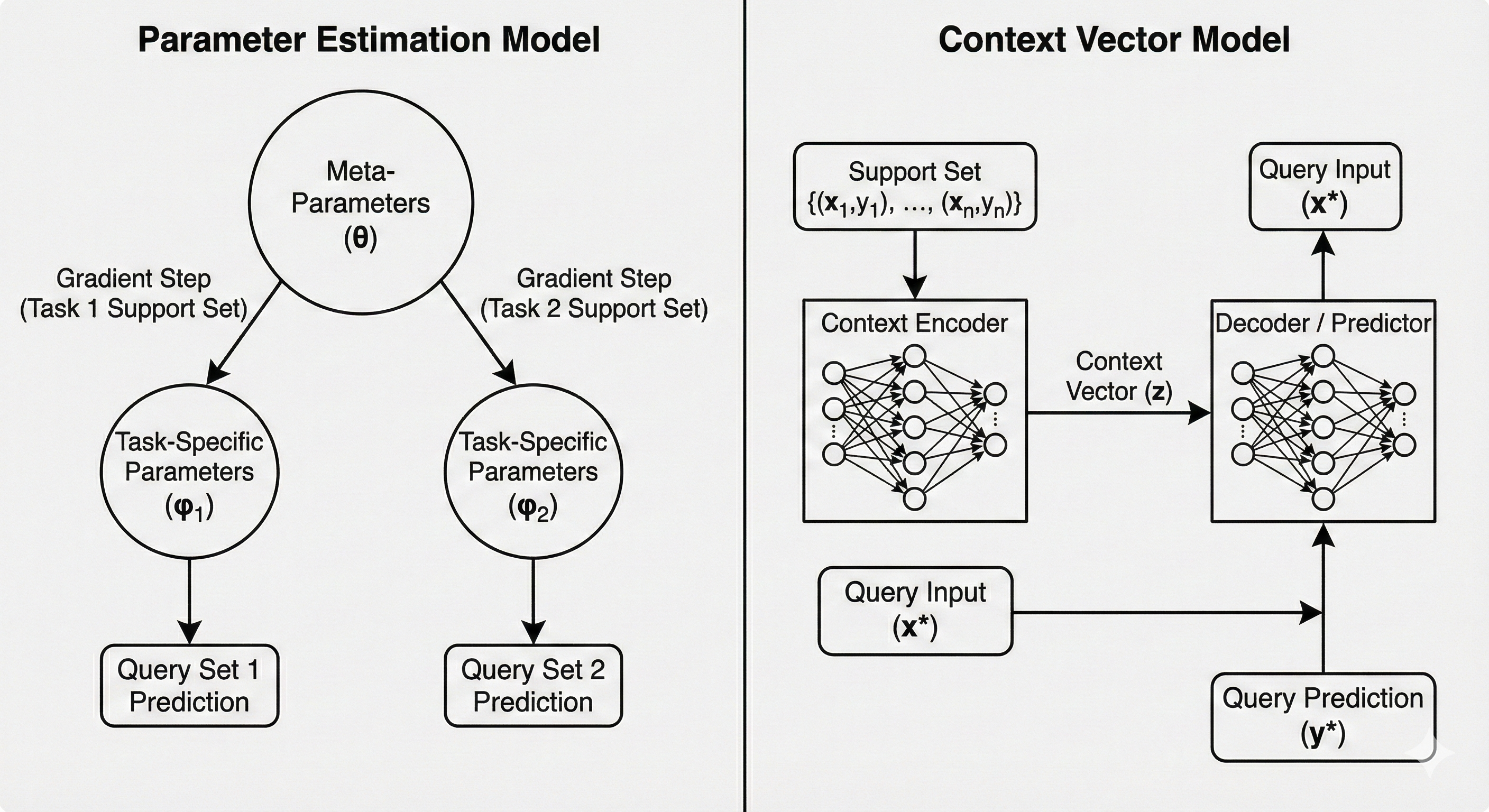 | \(y=g_{\phi}(x)\) | \(y^{ts} = f_{\theta}(\mathcal{D}^{tr}, x^{ts})\) | |
