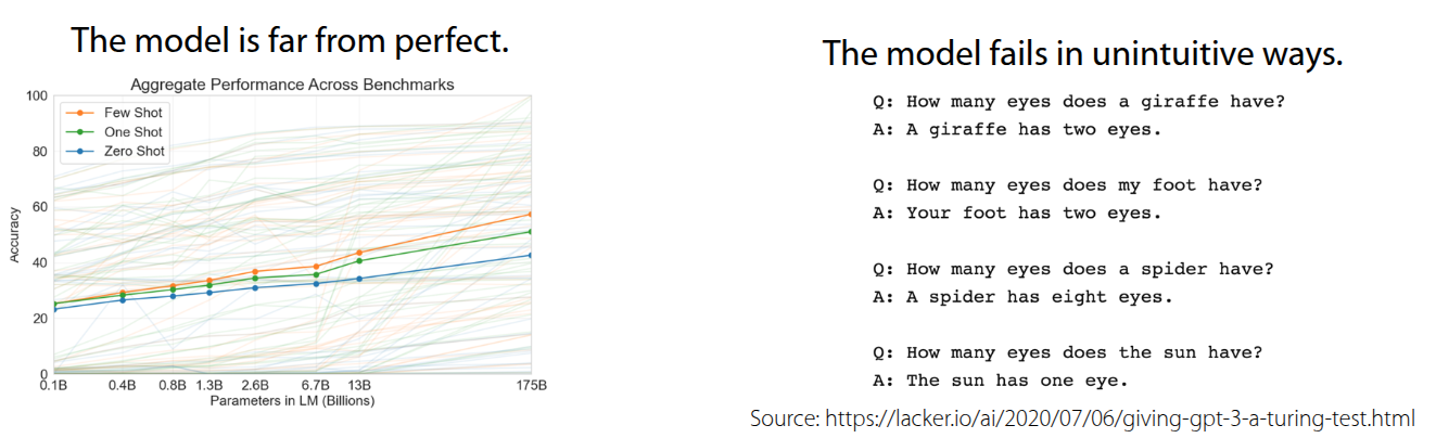 On the other hand, the lecture also addressed the limitations. Despite being trained on massive amounts of data, the accuracy for Few-shot/One-shot/Zero-shot Learning remains relatively modest compared to the volume of training data. In fact, even with 175 billion parameters, GPT-3’s performance across various benchmarks hovered around the 50% accuracy mark.