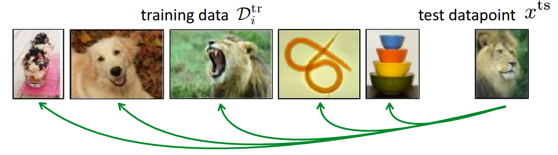 \[ \hat{y}^{ts} = \sum_{x_k, y_k \in \mathcal{D}^{tr}} f_{\theta}(x^{ts}, x_k) y_k \]