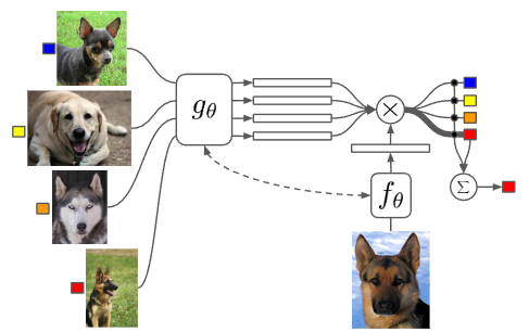 First, to resolve the mismatch issue, they attempted to find correspondences using the latent context within the data rather than the raw data itself. To achieve this, separate encoder networks were attached to extract context from both the training data and the test data. Once the training and test data are mapped into the embedding space, the similarity between them is calculated using methods like the dot product. Then, a softmax function (\(a(x^{ts}, x_k) = \frac{\exp(\text{cos}(f(x^{ts}), g(x_k)))}{\sum_{x_j} \exp(\text{cos}(f(x^{ts}), g(x_j)))}\)) is applied to these calculated similarity values to obtain weights (probabilities) across all training data. The final label is then inferred through a kind of weighted sum, multiplying these obtained values by the actual ground truth labels of the training data: