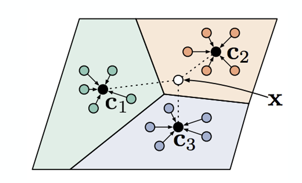 Figure 6 visually represents the method introduced above. If we want to determine the class of the white dot, \(x\), the prototype for each class is calculated as follows. This is the process of computing the average of the embedded data points for each class.