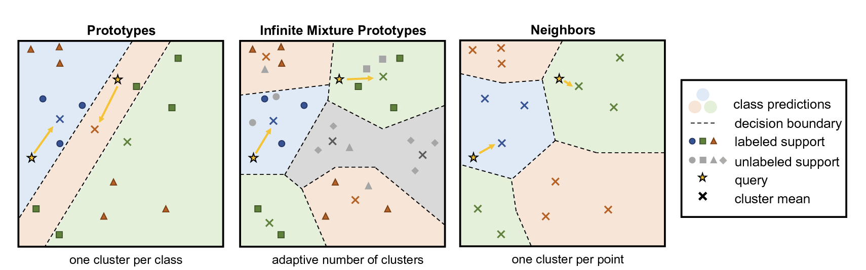 Figure 8 also describes an architecture called Infinite Mixture Prototypes (IMP), introduced as a method for extracting complex relationships between data points. This architecture was proposed in the paper by Allen et al. (2019) to improve upon the aforementioned Prototypical Networks, which calculate similarity through the representative value (Prototype) of clustered data. The professor briefly explained the necessity of this method with an example: even within the ‘cat’ class, there might be unusual breeds that look similar to dogs. If we force such cases into a single prototype, the performance will actually degrade. Therefore, the idea proposed in the paper is not to unconditionally assign a single prototype per class, but to adaptively generate multiple prototypes based on the actual distribution of the data. Consequently, the number of clusters can also be flexibly adjusted, allowing the model to handle complex relationships between data points.