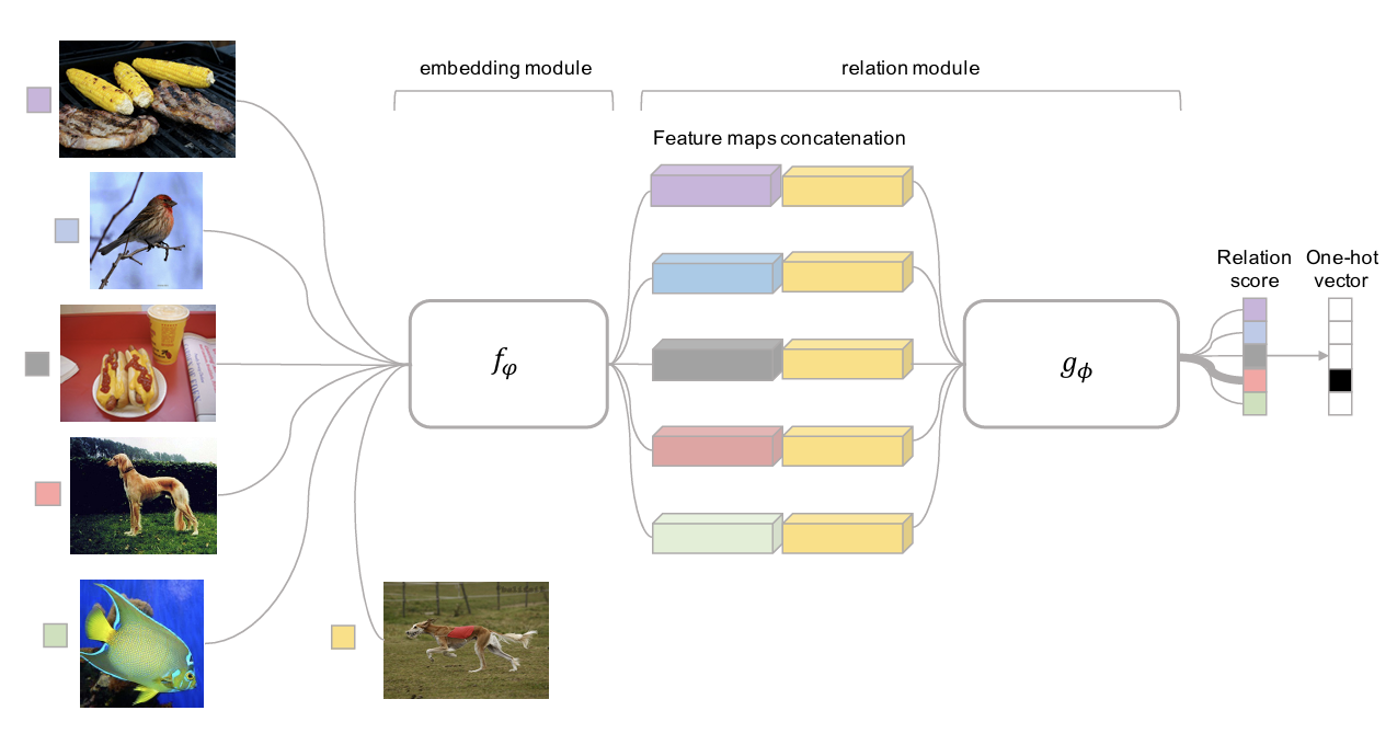 Figure 7 illustrates an architecture called Relation Networks, introduced in the paper by Sung et al. (2018), which is a method of training a neural network to perform the distance calculation process briefly mentioned earlier. Previous methods utilized predefined distance functions like \(\ell_2\) Distance or Cosine Similarity after embedding; however, in this case, it was difficult to accurately calculate the similarities between data points with complex relationships. To solve this, the paper first extracts the feature maps of the test data and training data through an embedding module (\(f_\phi\)) and then concatenates these feature maps. Afterwards, by feeding this output into the subsequent relation module (\(g_\phi\)), the model is designed to estimate the test data’s label based on the resulting Relation Score.