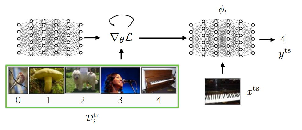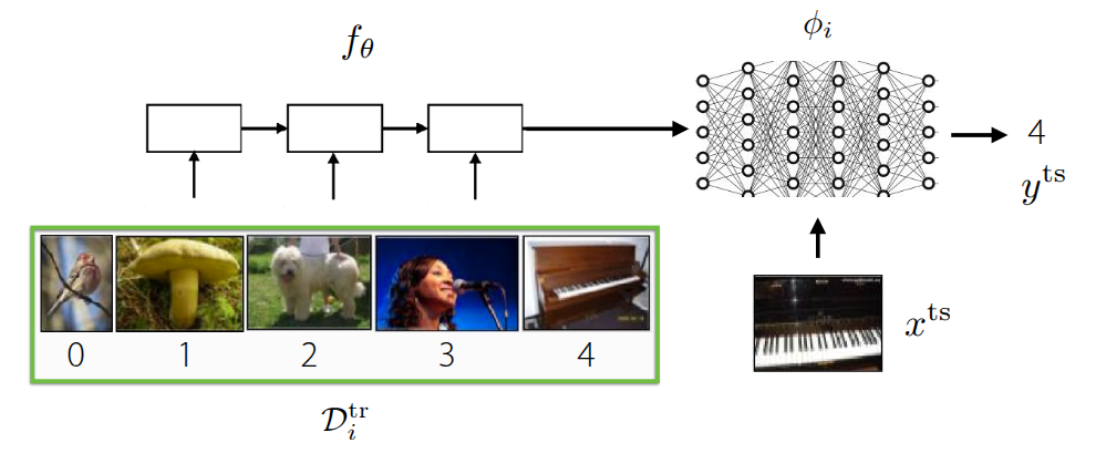 However, if we project this low data regime situation onto meta-learning, a very similar scenario occurs during the meta-test phase. Specifically, in cases like Few-Shot Learning performed during the meta-test, the model must estimate the correct label (\(y^{ts}\)) for an unseen task even when there are very few samples (\(x^{ts}\)) available. The parametric models mentioned earlier introduce drawbacks precisely during this process of inferring the task parameters \(\phi_i\).