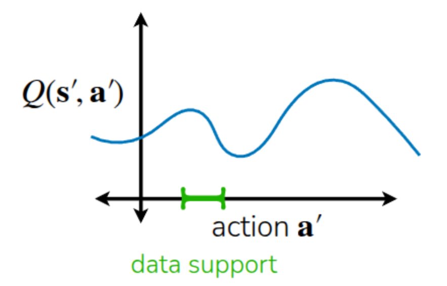 When training a traditional Off-policy method, the model must calculate the Q-value for the next action \(a'\) to be taken in the next state \(s'\) in order to update the policy currently being trained. However, this is an action sampled from the current policy \(\pi_{\theta}\), and there is a possibility that it does not exist within the data accumulated by the previous behavior policy \(\pi_{\beta}\). If it were Online RL, the model could simply explore and immediately update the Q-value for that action. But since Offline RL uses a static dataset, if the action is absent, the corresponding Q-function will inevitably be inaccurate. Just like the autonomous driving model training example mentioned earlier, the model might attempt to explore dangerous behaviors not present in the dataset, such as making a U-turn on a highway.