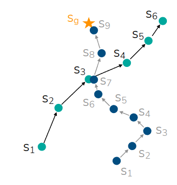 The area where Offline RL gains a strong advantage over Imitation Learning is Trajectory Stitching, introduced in Figure 2. As shown in the figure, assuming there are two trajectories (\(s_1 \rightarrow s_6, s_1 \rightarrow s_9\)) in the offline dataset, and \(s_3\) and \(s_7\) are states in close proximity: if we simply perform Imitation Learning, the model wouldn’t reach the target destination \(s_9\) unless it starts from the exact same state. However, Offline RL can utilize internal information to determine that \(s_1 \rightarrow s_3\) and \(s_7 \rightarrow s_9\) are partially good trajectories, and can ultimately be trained to find and stitch together the optimal trajectory of \(s_1 \rightarrow s_9\).
