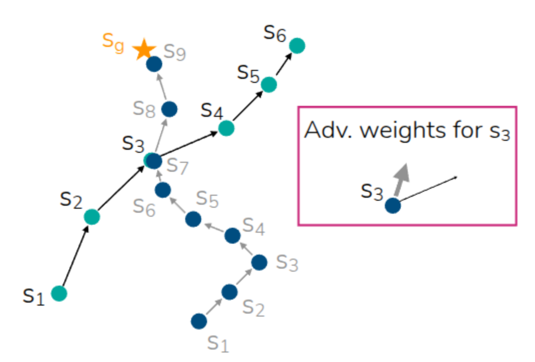 Then, even in the previous Stitching example, by identifying the value of a good action through the Advantage weight even in similar states between two trajectories, we can create a trajectory that is helpful for learning. For reference, a question arose during the lecture asking if identical states between trajectories in the dataset were strictly necessary, as in this example. The professor mentioned that, due to the representation characteristics of neural networks, the Advantage for similar states can be utilized even if they are not exactly identical. He also added that while it is written in the form of Exponentiated Advantage in the equation above, in practice, a form with an arbitrary hyperparameter added (\(\exp(\frac{1}{\alpha}A(s, a))\)) is used to prevent the value from becoming excessively large.
