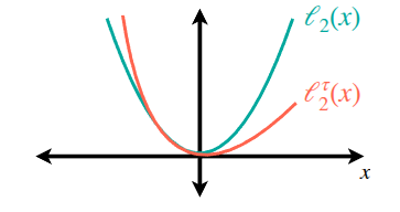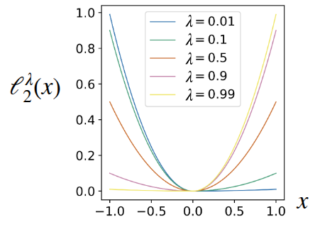 \[ \ell_2^{\lambda}(x) = \begin{cases} (1 - \lambda) x^2 &\text{if } x < 0 \\ \lambda x^2 &\text{otherwise} \end{cases} \]