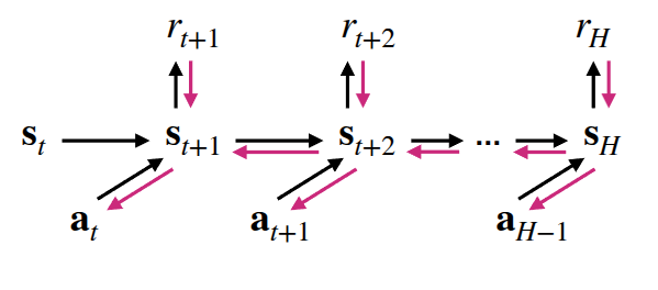Here, \(\nabla_{a_{t:t+H}} \sum r\) is calculated from the dynamics model. We can use chain rule.