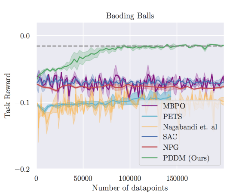 In the setup described in the paper, the state includes information about both the robotic hand and the manipulated object, and the reward reflects how well the object follows the target behavior, with penalties for failure cases such as dropping the object. To reduce model error, the method uses an ensemble of learned dynamics models, and planning is performed with a modified CEM-style optimizer inside MPC. The comparisons in the paper include both model-free baselines such as SAC (Haarnoja et al. (2018)) and NPG (Kakade (2001)) and model-based baselines such as MBPO (Janner et al. (2019)), PETS (Chua et al. (2018)) , and earlier work (MBMF - Nagabandi et al. (2018)) by the same authors. The main takeaway is that planning with learned models can yield strong data efficiency, which is especially important in fragile real-world hardware settings where data collection and reset costs are high.