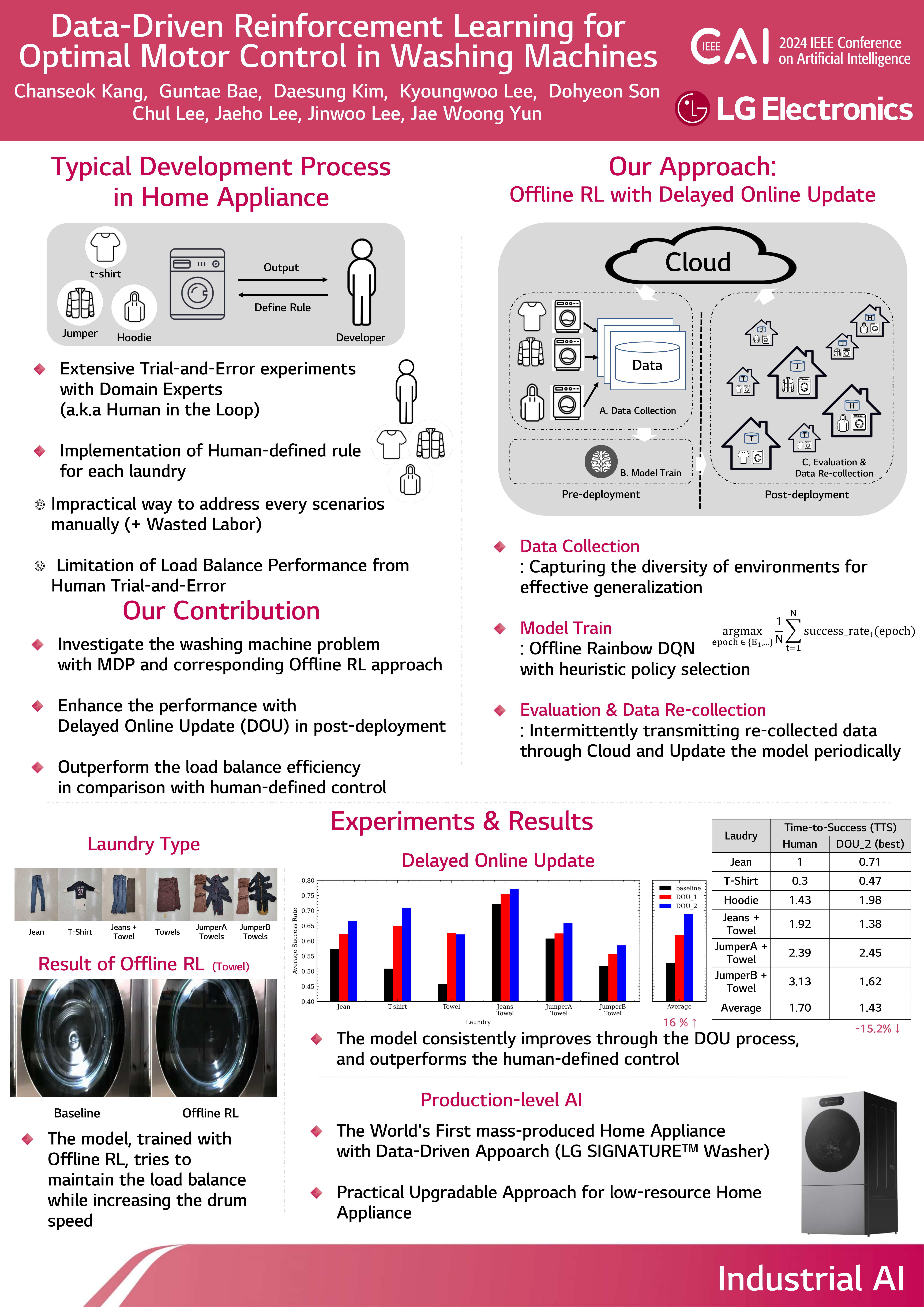 Delayed Online Update combines real washing-machine operation data with continual offline reinforcement learning to improve load balancing during dehydration without hand-coding every laundry scenario.